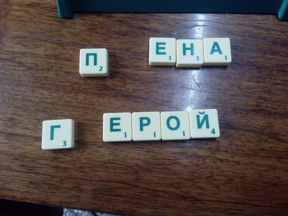 В конце хода подсчитываем очки, они начисляются за самое большое свежесоставленное слово. Всё просто: сколько букв-столько и очков. За все другие слова игрок ничего не получает. Таким образом за слово ГЕРОЙ, я получу 5 очков. А за слово ПЕНА-ничего. Дальше я добираю на подставку фишки так, чтобы их у меня было 7.