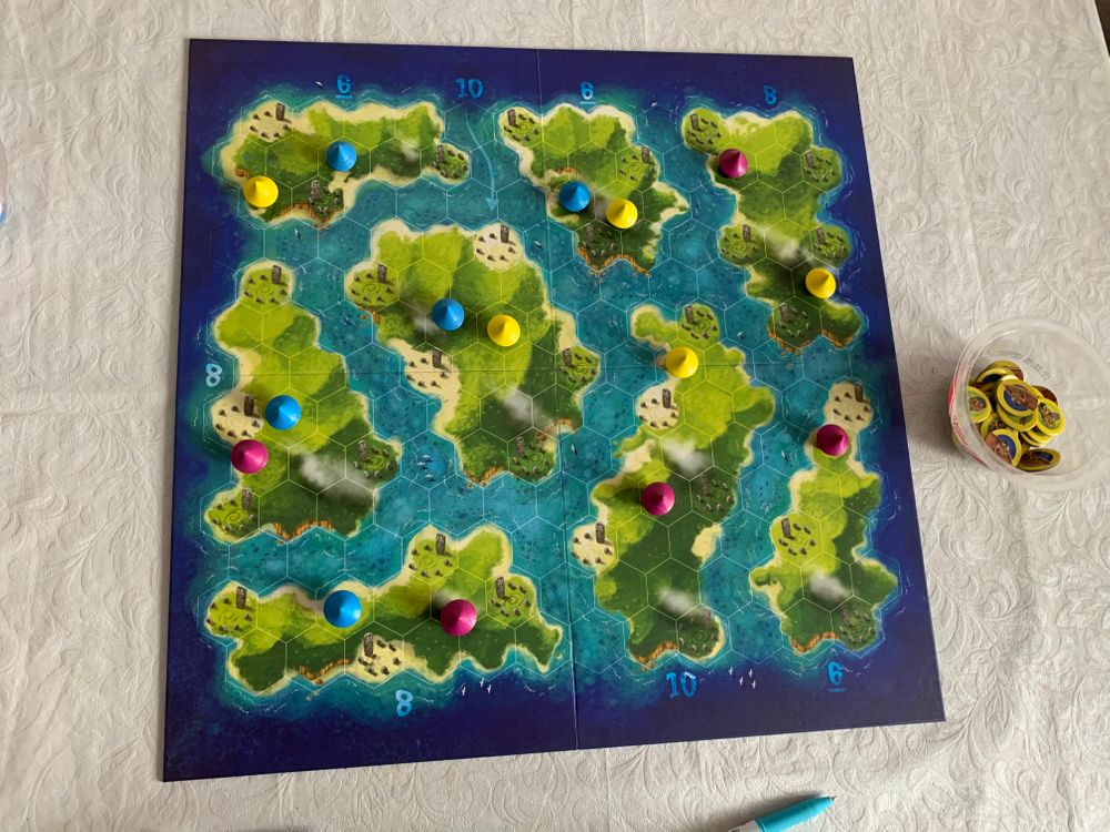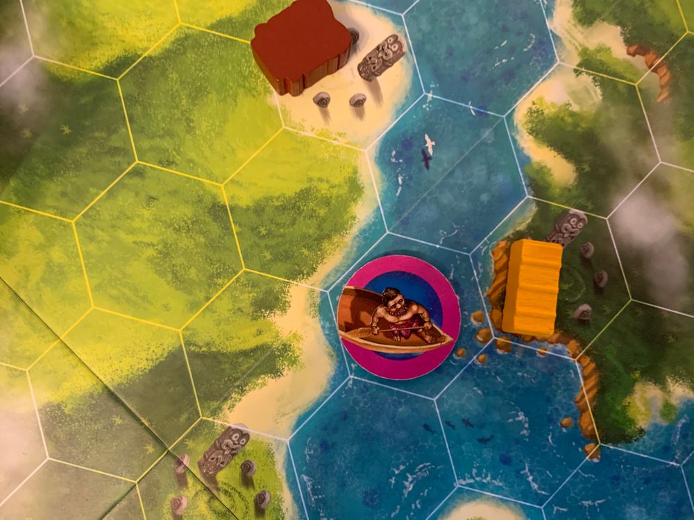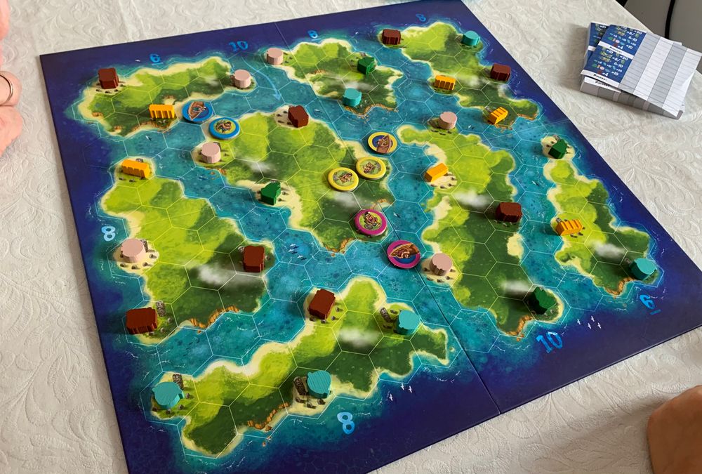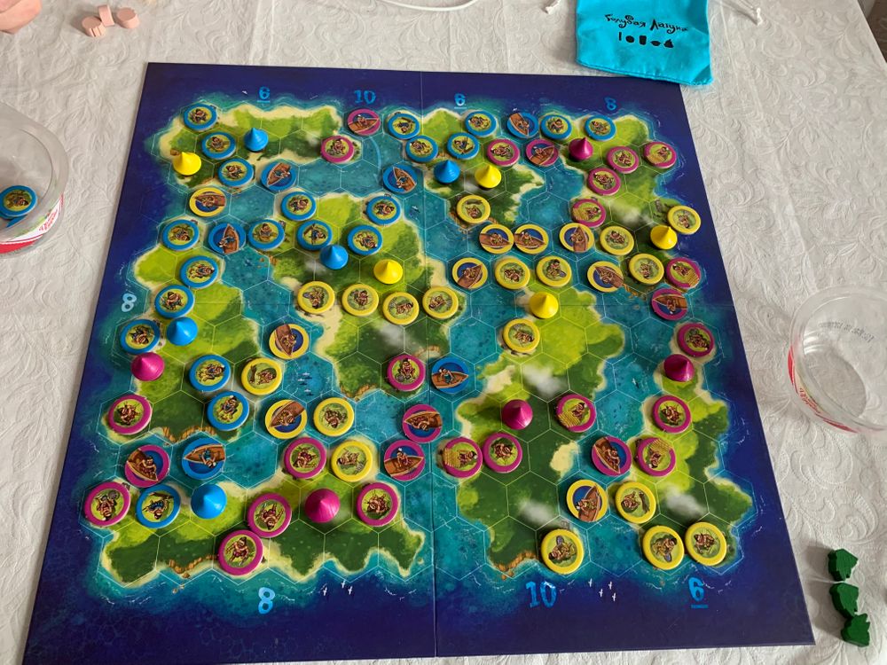 Пара слов о наших впечатлениях. Игра очень быстрая! Каждая фаза может длиться 5-7 минут, больше времени занимает подсчёт очков). При очень простых правилах каждый размещённый жетон или хижина обретает очень большое значение. Очки можно получать разными, порой взаимоисключающими друг друга способами, так что каждый раз надо делать выбор, что делать в следующий момент: захватывать острова или собирать ресурсы, строить цепочки или успеть побывать на каждом острове? В игре нет места случайности, результат зависит только от игроков. Игра может быть довольно агрессивной, когда соперник запирает тебя своими жетонами и не даёт распространяться по карте, особенно во второй фазе.