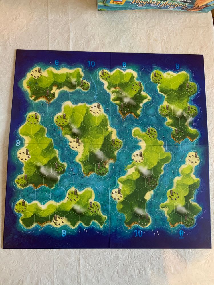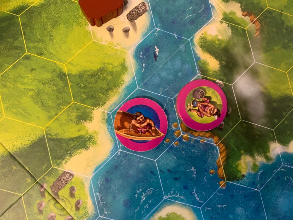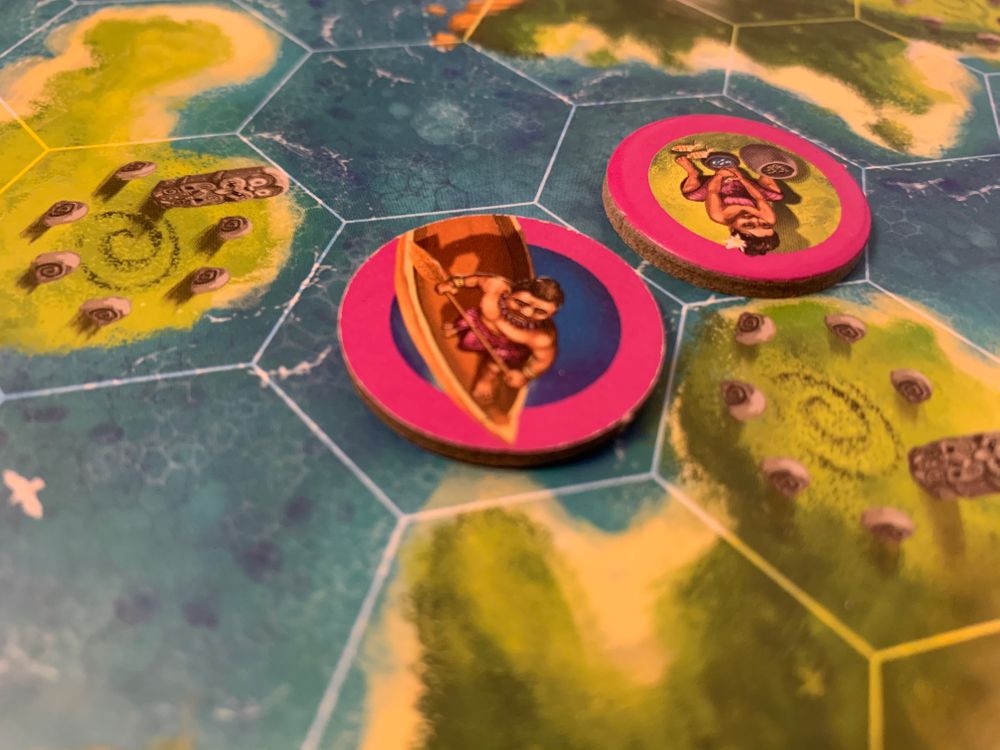 Игра состоит из 2 фаз. Первая фаза исследования. Начиная с первого игрока, все начинают по одной выкладывать свои фишки на поле водной стороной на море и сухопутной на остров. В первой фазе мы можем выкладывать водных туземцев куда угодно, а вот наземные должны прилегать к уже выложенным туземцам нашего цвета. То есть, завоеватели приплывают с моря и начинают расселяться по островам).