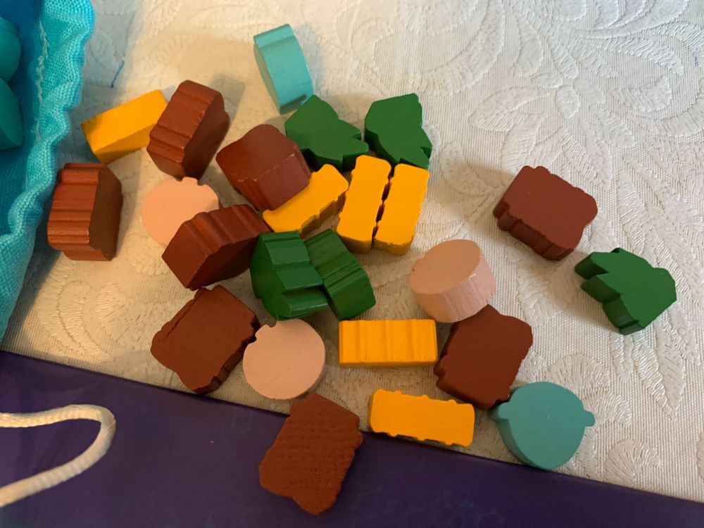 В специальном мешочке хранятся деревянные фишки 4 разных ресурсов (кокосы, вода, бамбук и драгоценные камни) и коричневые тотемы. Они перемешиваются и рандомно выкладываются на карту в специально отведённые места, отмеченные кругом из камней.
