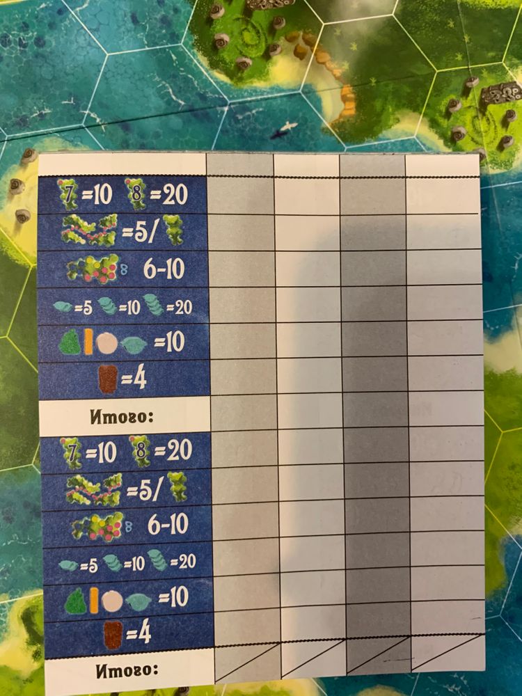 Мы получаем очки за посещаемые нами острова. При посещении всех восьми - 20 очков, при посещении 7- 10. Если островов меньше не получаем ничего. Далее каждый из островов соединённых единой цепочкой жетонов нашего цвета приносит 5 очков. У всех островов есть своя ценность от 6 до 10, мы подсчитываем отдельно у кого большее количество фишек на каждом острове и игрок получает соответствующее количество очков. Сеты из разных товаров приносят нам от 5 до 20 очков в зависимости от размера самого сета. Разнообразие товаров тоже может принести 10 очков. Ну, наконец, каждый тотем тоже приносит по 4 очка! 😅