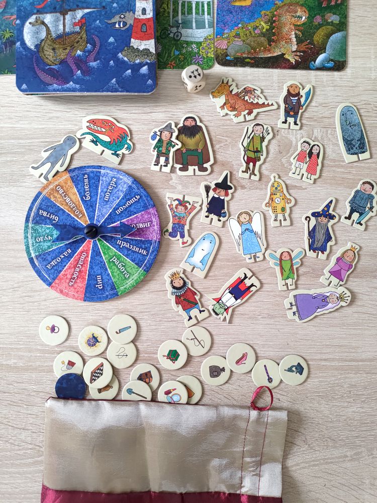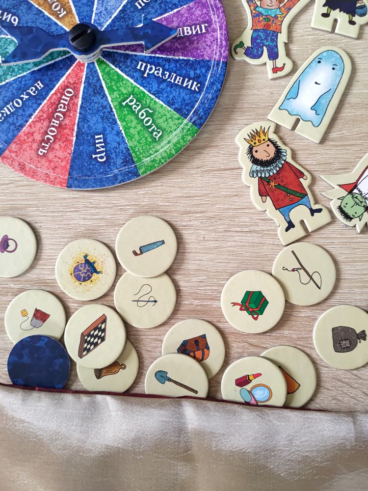 Базовые правила игры довольно просты, они описаны в красочной брошюре. Выбираем несколько локаций, раскладываем, выбираем героя, с которым будем себя отождествлять. Ставим героев на одну общую локацию, и по очереди кидаем кубик, который направляет каждого героя на разные локации. Встав на нее, мы берем несколько жетонов, количество зависит от числа играющих, крутим рулетку, смотрим какое слово там написано, обязательно используем его в игре. И начинаем придумывать.... На мой взгляд, эти жетоны очень удачная придумка, надо умудриться вставить порой очень несуразные вещи в нить своего рассказа. Например, ты на Северном полюсе, а в руках только помада, нитка с иголкой и шахматы. Вот и выкручивайся как хочешь))