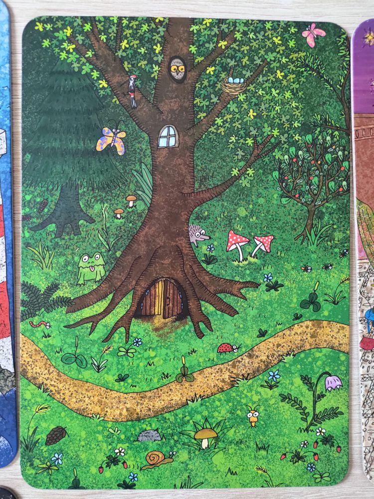 Когда я первый раз ее открыла, я восхитилась карточками-локациями, они довольно большого размера, очень плотные. А такие иллюстрации мне очень по душе.