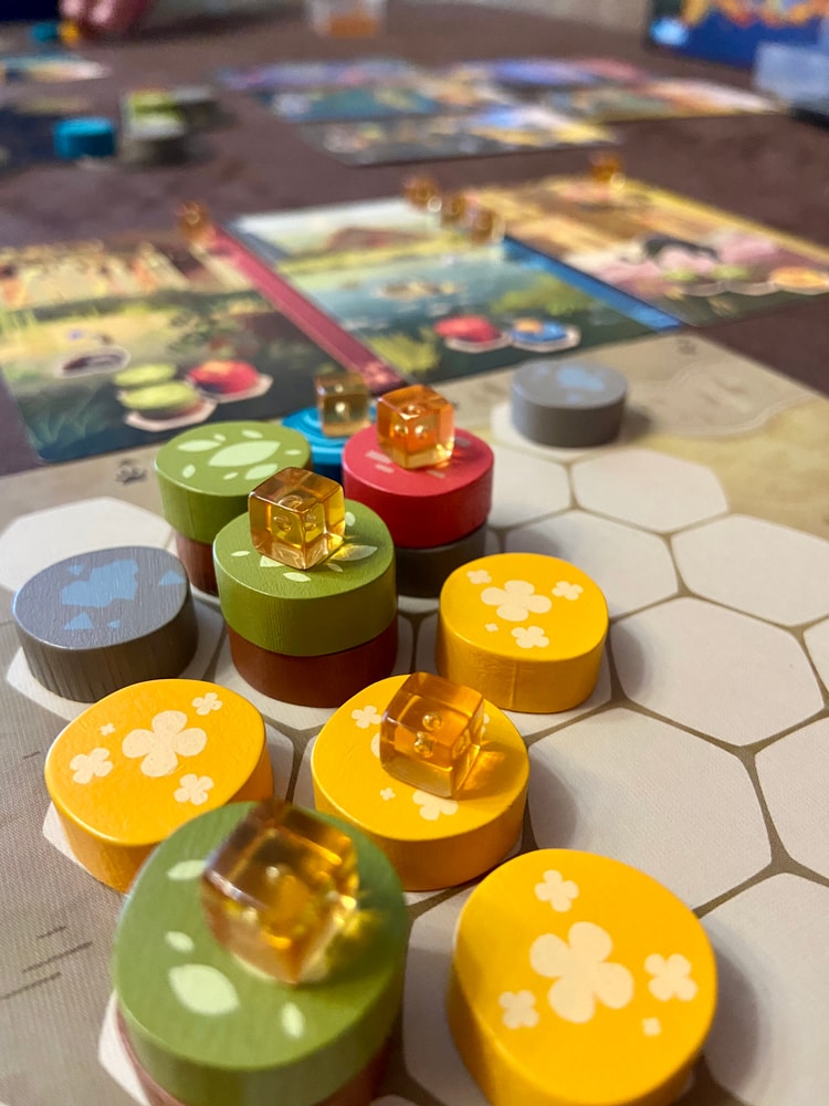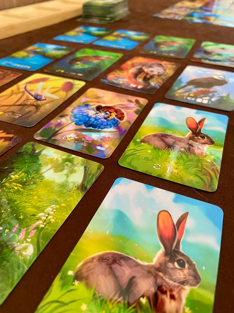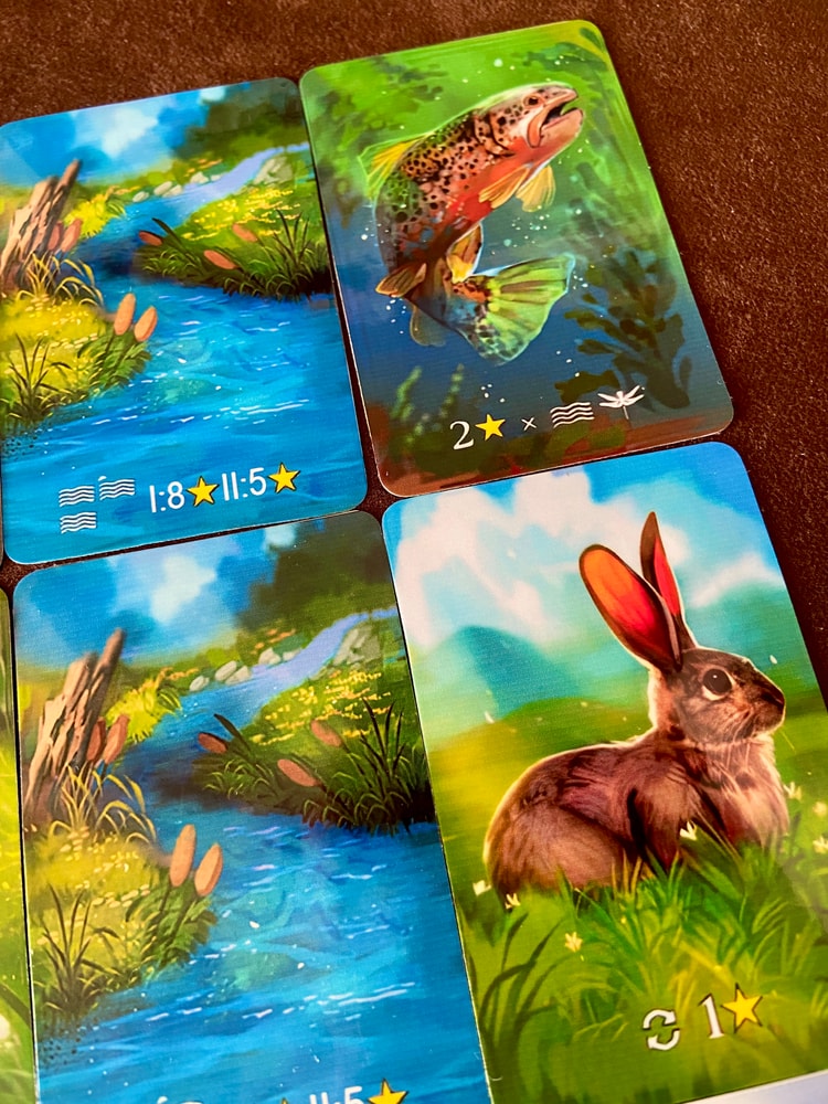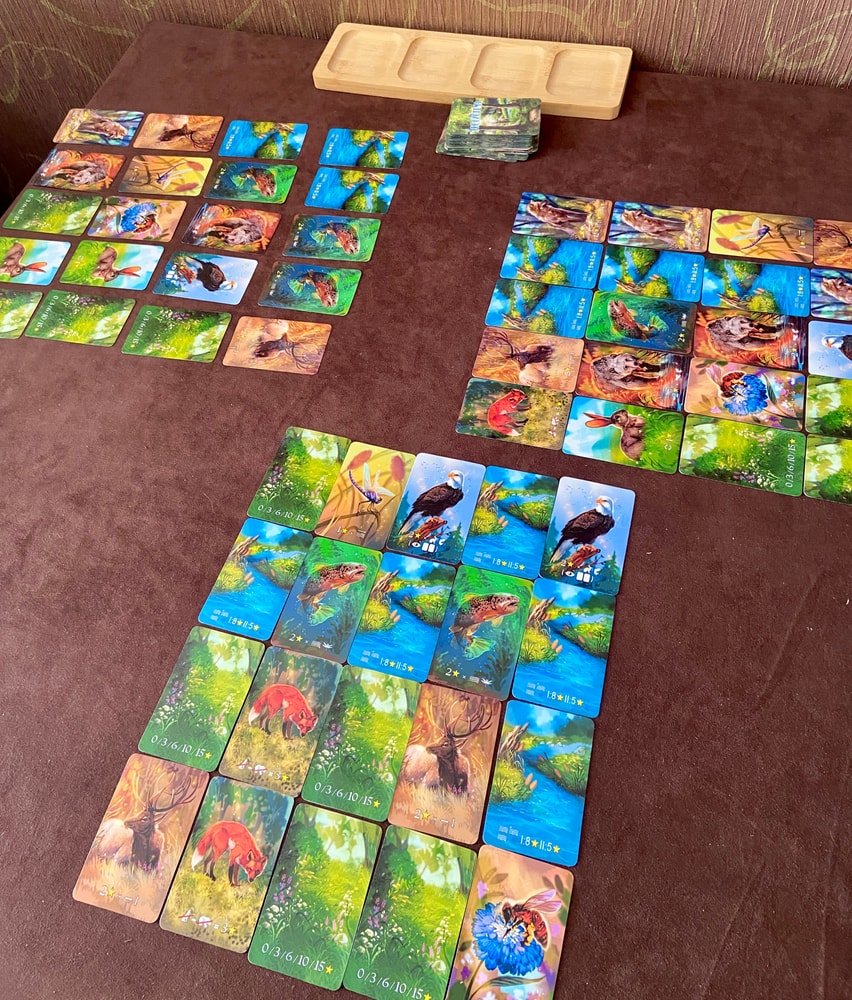 Очень удобно, что условия получения очков написаны на каждой карте. Игра на 10-15 минут, несложная, красивая - семья никогда не отказывается сыграть! Ещё только нащупываем варианты стратегий, я часто собираю лис, волков, длинный ручей. Муж тестирует то луга, то ручей, делает ставку на орлов и разнообразие. Дочка еще плохо пространственно на будущее думает, но по очкам отстаёт совсем чуть-чуть! Часто её разнообразие подводит.