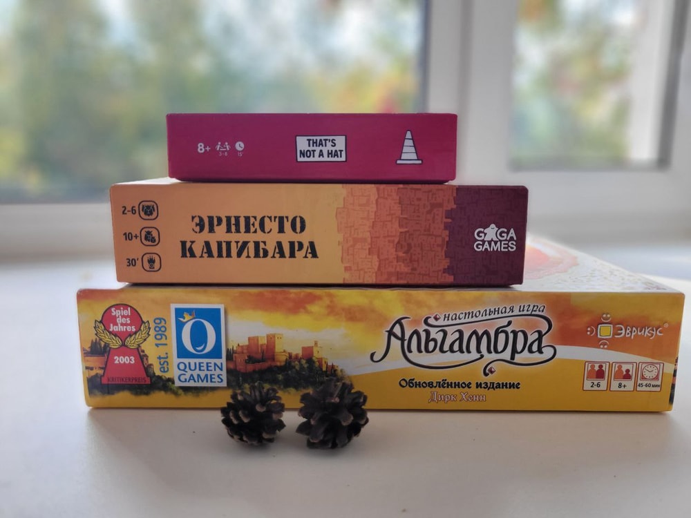 Во все три играли в августе, все очень нравятся. Альгамбру доставали реже, она все-таки требует больше времени и места на столе. Это скорее коробка в мою «золотую» коллекцию. А две другие я постоянно предлагала детям и гостям и несколько раз брала с собой в гости (Шляпу больше уже в сентябре, т.к.она пришла в самом конце августа).