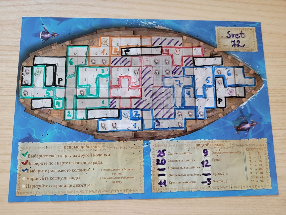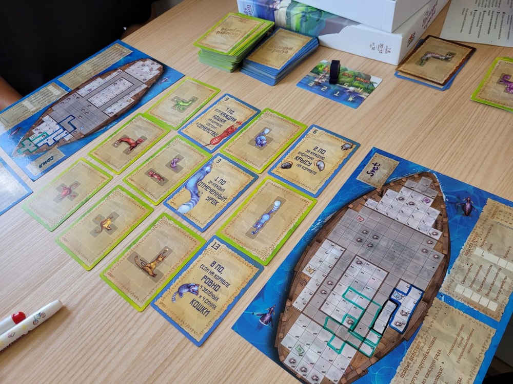 Поэтому дочка брала ее в гости, и там они играли без меня. Я иногда даже выигрываю, хотя стабильно оставляю незакрытыми 2-3 каюты и беру мало уроков. Как-то так получается скомбинировать возможности, хотя до подсчета очков совершенно не понятно, кто же лидирует. Мало какие уроки мне нравятся, особенно в начале партии трудно спрогнозировать смогу ли я нарисовать ровно 4 кошки какого-то цвета. Поэтому я чаще всего беру одни и те же уроки (заполнить обе каюты капитана, например), если они выходят. Или беру уроки в конце партии, когда уже понятно, какие я смогу выполнить.
