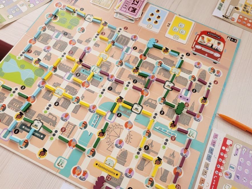 Фото из моего старого обзора, т.к. оказалось, что у меня нет фотографий этой партии. С нами играл мой сын, которого мы обычно в игру не брали, т.к. ему было сложно. Но сначала он нас удивил тем, что знал правила (видел раньше, как мы играли, и запомнил), а потом еще и сыграл неплохо, хотя и не выиграл. Впятером довольно тесно, часто образуются пробки, которые приносят штрафы (у меня было 9 или 10 штрафных очков за пробки), и еще один нюанс – в игре два похожих цвета палочек, никак я не пойму, почему пятым цветом не выбрали что-то отличающееся. Мы почти не путались, но тем нее менее, это немного напрягает, хоть самой перекрашивай. Жду похожую игру Париж-Рим, вроде обещали в следующем году, интересно, чем будет отличаться, кроме поля.
