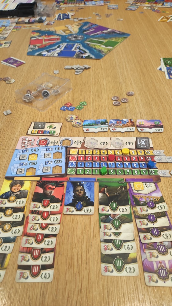 Экономическая стратегия — смесь «7 чудес» и «Роскоши». Нужно грамотно покупать карты ресурсов: деньги, война, письменность и население. В этот раз я не учла население, купила карты, которые не сыграли, и только к концу начала нагонять соперников. Игра хорошая, но, на мой взгляд, проигрывает «Хоре» и «7 чудесам».