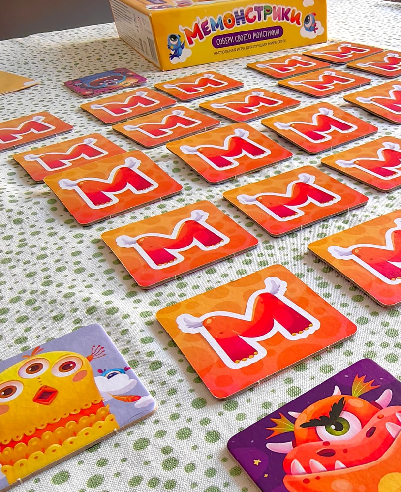 Мемонстрики - мемо с небольшим усложнением. Нужно собрать только карточки с частями своего монстрика. Во-первых, они не всегда стыкуются, а значит остаются на поле до лучших времен. А во-вторых, хвост также можно взять только как последний элемент, т.е. он тоже будет ждать своего времени. Есть еще карточки особых действий. Ребенок любит тему монстров, поэтому игра любима, и мне в меру азартно играть в такое, я не против😁.