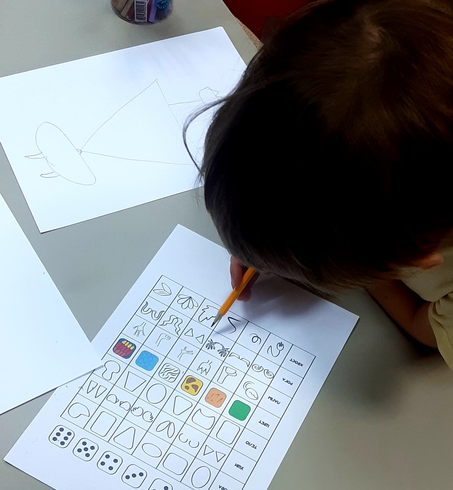 Творческая часть- рисовали невиданное животное с помощью фантазии и подсказки- конструктора. С участием кубика выбирали какие именно уши, рога, тело можно нарисовать. Кубик взяла двойной, чтоб показывал два числа, для возможности выбора.