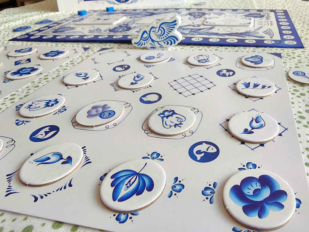 Гжель оказалась для меня невероятно сложной игрой. Всë, что я пробовала до этого и считала очень мозголомным, блекнет на ее фоне😂. Причины этому две. Первая - цели на каждый раунд. Их три и два поля. Первая цель на оба поля, вторая - только для правого, третья - только для левого поля, но в следующем раунде для правого🤯. А еще на второй целе есть подсказка, какая цель в следующем раунде будет для обоих полей. И желательно, выполняя цели этого раунда, просчитать, как максимально подготовиться к следующему, а это огромное количество комбинаций, прокручиваемое в голове, на которое мне нужно очень много времени😁. Если вам кажется, что пока все просто, то вот вторая сложность. Все действия происходят с жетончиками цветков пяти видов и все они синие, а потому как будто одинаковые. В моей голове постоянно звучит такой монолог: "Какой цветок я хотела сюда положить? Ах да, синий!"🤣 Вся надежда на соло - интересно, сколько часов мне понадобиться на одну партию🤔.