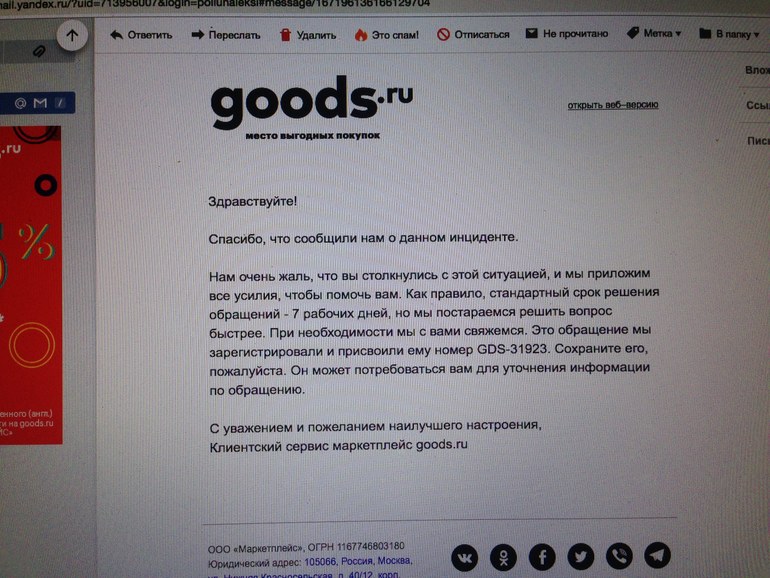 Улыбнись)После запроса, которое Вы попросили сделать Селфи с паспортом, мы не получили ответ. В течение 7 рабочих дней мы не получили ответа ... Обратите внимание , goods начинает обманывать , поднимает темы для обсуждений ...