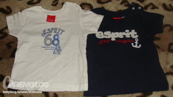 Футболочки в морском стиле ESPRIT 3-6 мес, одеты от силы раза два 300 руб за две.