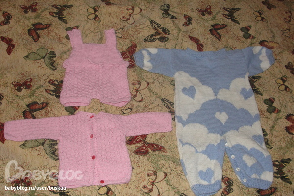 Песочник, кофточка к нему и комбез. Комбез такой же есть уже в розовом цвете. А голубой песочник в начале пути) И пинеточки тоже.
