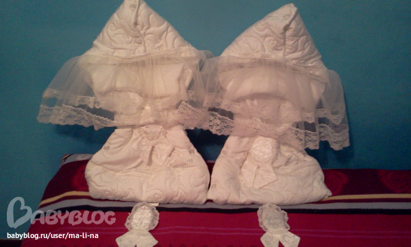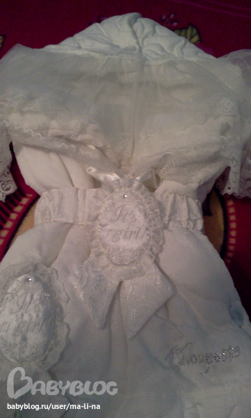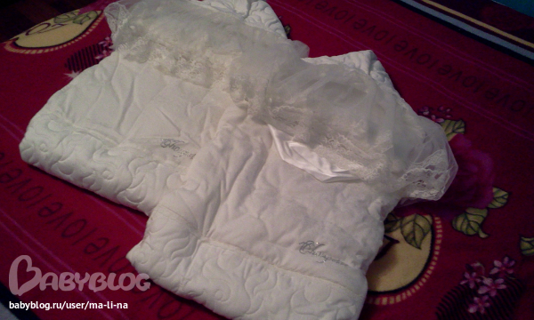 Очень красивый и нарядный конверт на выписку.(я потом тоже использовала,на прогулку в коляску) Конверт выполнен из принтованного хлопка и декорирован итальянским кружевом и стразами Swarovski . Съёмная вуаль защитит Вашего малыша от посторонних взглядов, а удобные застёжки по бокам облегчат эксплуатацию.Состав - 100% хлопок....еще у ним идет резинка-пояс,очень удобно нести малышка.(см ниже)