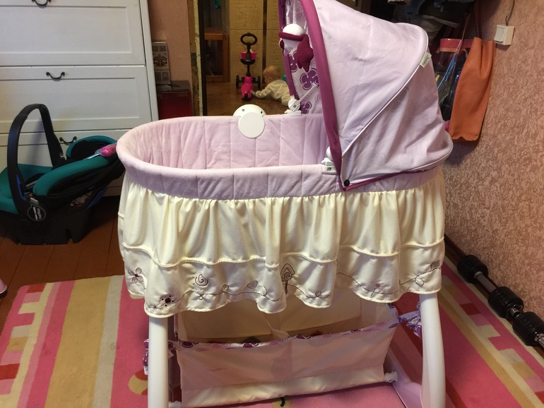 - вместительная тканевая корзина для детских принадлежностей или игрушек расположена под днищем колыбели