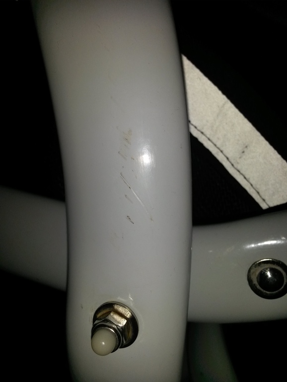 Недочеты: немного протерлись крышечки от люлек, в тех местах где они соприкасаются друг с другом, и после стирки отбилась краска с кнопок на этих же крышках от люлек, в принципе не заметно в эксплуатации, можно замазать лаком для ногтей. И есть маааленькие царапины на раме. Фото недочетов:![]()