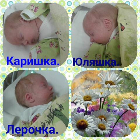 Сегодня, в наш первый праздник, мне разрешили приложить Леру и Каришку к груди))) УРА!!! ИТОГ: Лера съела 2мл., Каришка 6мл)) СУПЕР!!! Юляшу пока не прикладываем,т.к. и рожок ей дается с трудом, если еще и грудь дам, так точно не хватит сил на то,чтобы съесть свою норму.