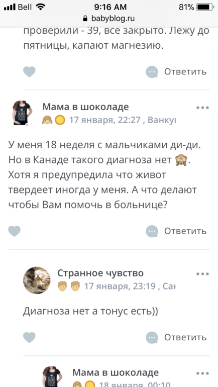 У меня 18 неделя с мальчиками ди-ди. Но в Канаде такого диагноза нет 🙈. Хотя я предупредила что живот твердеет иногда у меня. А что делают чтобы Вам помочь в больнице?