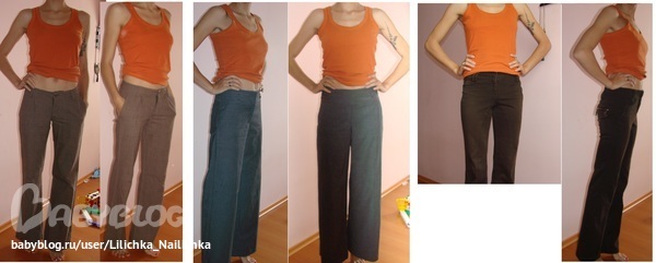1) Брюки: клешеные от бедра песочного цвета в мельчайшую клетку; однотонные серые; плотные коричневые с легким клеш от колена, "вставками" между ног как у ковбоев и цепочками на карманах на попе