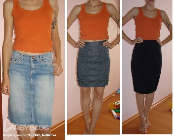2) Юбки прямого фасона: джинсовая широкая по колено; серая мини со шнуровками спереди и по бокам аля "карандаш"; черная карандаш ладонь выше колена