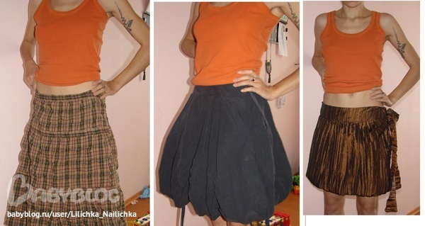 3) Юбки широкие: шерстяная в пол песочная в клетку солнце; темно-синий балон; балон из золотой парчи - балон потому, что попы у меня вообще никогда не было=(