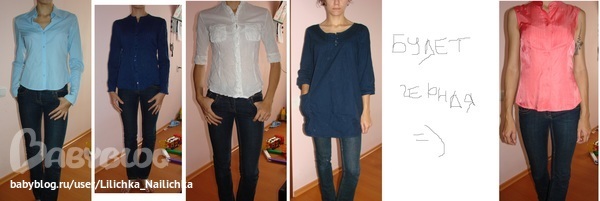 6) Рубашки: классическая голубая, темно-синяя без воротника, белая без воротника с рукавом 3/4 и типа жабо, туника темно-синяя без воротника, классическая черная больше на размер, коралловая без рукавов с воротником стойкой