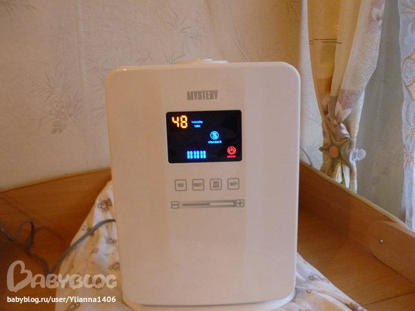 Очень долго и муторно искала достойный увлажнитель воздуха,так как комната у нас не очень большая (14м), но две батареии, одна из которых вмонтирована в стену! Прочитала кучу отзывов и описаний, и все таки остановилась на недорогом Мystery,нужно сказать, что данный увлажнитель сразу покарил меня своим дизайном, очень все красивишно сделано, и экранчик большой. В увлажнителе также имеется функция ионизации, ночной режим и можно, что естественно устанавливать свою степень увлажненности!!! Так что покупкой довольна, вот стоит "пыхтит"!!!