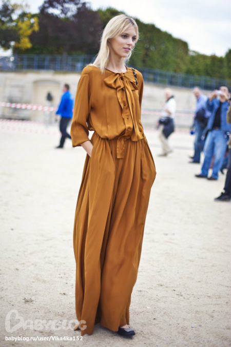 Легкие струящиеся ткани могут скрыть под собой лишние килограмы, кому это необходимо, а вот худощавым девушкам, как раз наоборот, помогут создать дополнительный объем. Для этого низ вашего комбинезона должен быть выполнен в виде "бананов" или свободный прямой. Примерно таже история будет с плотными хлопковыми тканями или тканями с добавлением шерсти, но силуэт лучше выбирать по фигуре с зауженными брюками к низу. А длина может быть полной или укороченной. Идеальное сочетание в таком исполнении комбинезона будет с высоким каблуком. Туфли могут быть с заостренным носом или же открытые босоножки.