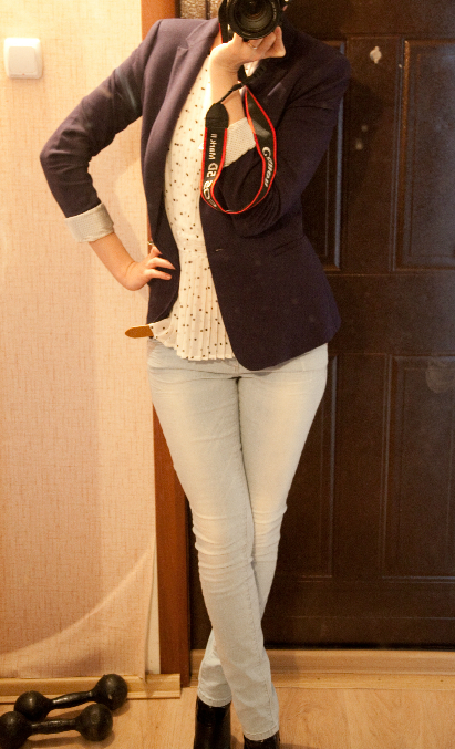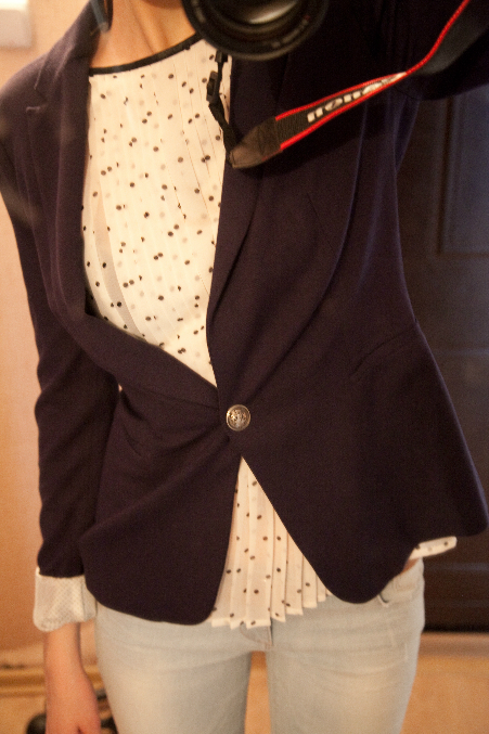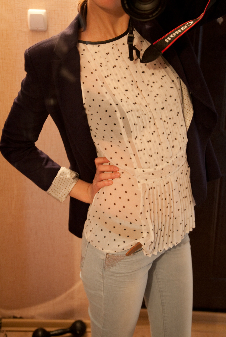 Синий Пиджак, Белая блузка в чёрный горошек, Голубые джинсы