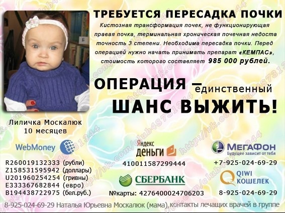 РазноеЯ на ББ уже давно и знаю здесь много добрых людей!Не пройдите мимо,помогите!Любая копеечка поможет!Девочки,посмотрите какая она очаровательная!Я поеду на неделе к ним,также нужны пюрешки и памперсы.
