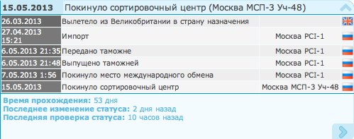 Интернет-магазиныНаша "Великая и Могучая", так я обычно называю Почту России и EMS Russian Post, что в принципе одно и тоже, превосходит по срокам доставки саму себя. Даже не знаю, как 1 кг пакет может доставляться из Великобритании 53 дня и до сих пор не доставлен, так что количество дней очевидно увеличится. От Великобритании до Москвы примерно 3,5 часа на самолете, все остальное время наши посылки лежат незарегистрированными, но даже спустя пару месяцев, когда они наконец-то проходят таможню, они еще месяцок где-то валяются. Представители славной службы отписываются, что посылка на территории России не зарегистрована, а значит они никакой ответственности не несут. Пусть, мол, отправитель ищет.