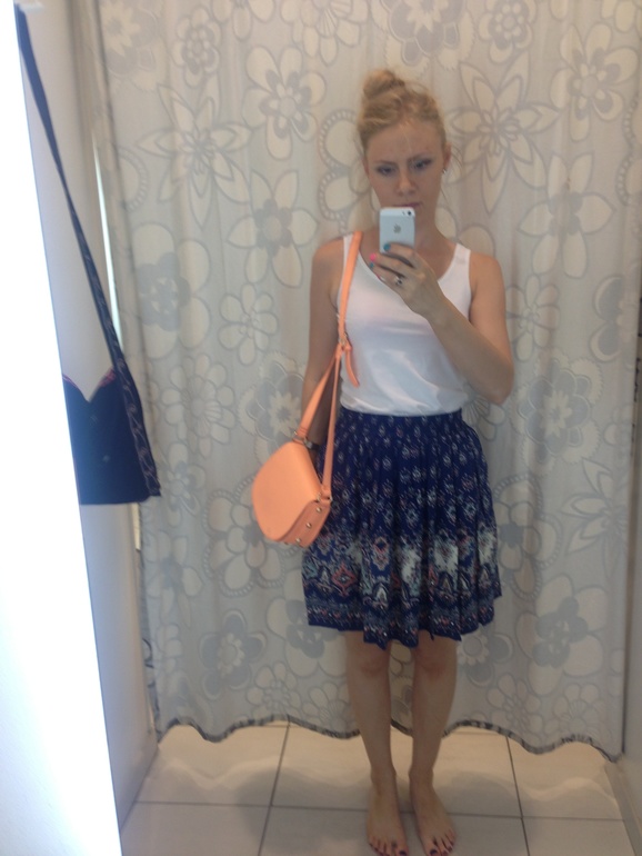 Белая майка с синей юбкой очень хорошо. На счет цвета сумки подумай как следует. Будет ли она подходить к остальному гардеробу? Ты лето?Если лето, то сумку выбирай из яркой палитры (используются