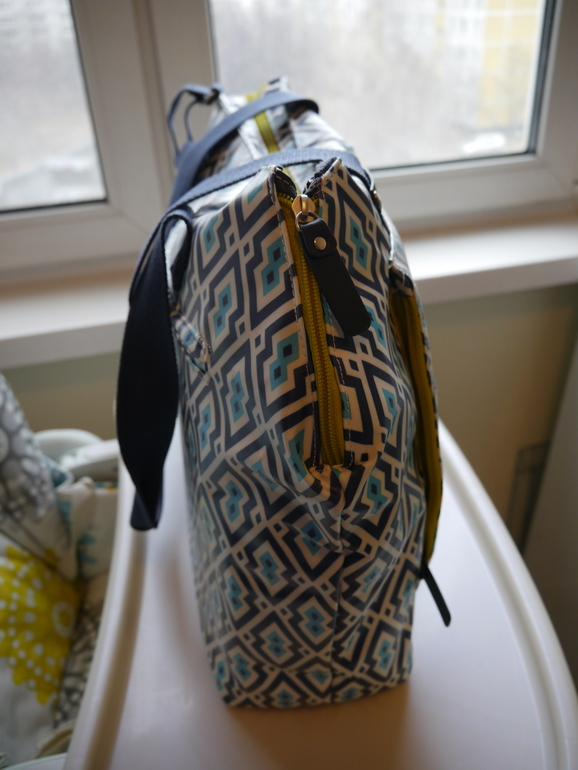 Материал сумки Skip-Hop похож на мягкую клеенчатую ткань - девочки, не знаю как описать точнее))) ткань как будто пропитана водооталкивающим слоем, но при этом не дубовая, а очень-очень мягкая (это даже муж отметил))) Я бы даже сказала, что она мягче, чем многие детские комбинезоны с водоотталкивающим слоем, которые порой «колом стоят» от резины.