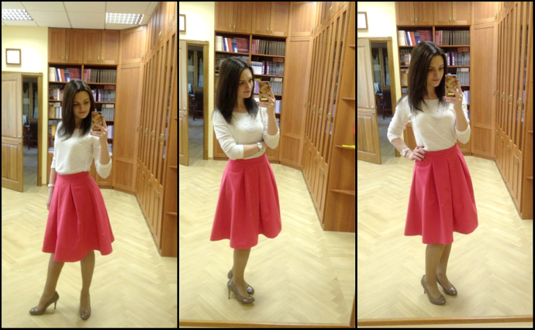 Спасибо!Юбка алая, за качество фото извиняюсь — это с телефона (((((Верх — да, белый, но не чистый, чуть грязноватый, совсем капельку.Очень нравится Ваше сочетание юбки и бижутерии! Красота!