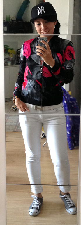 Вообще я покупала его еще и для комплекта, который был составлен стилистом для другой девушки. Он ниже. Конечно, у стилиста комплект более роскошный, у меня попроще, но я на него очень долго облизывалась,а тут еще захотела купить бомбер под кепку(да да, именно так, не наоборот