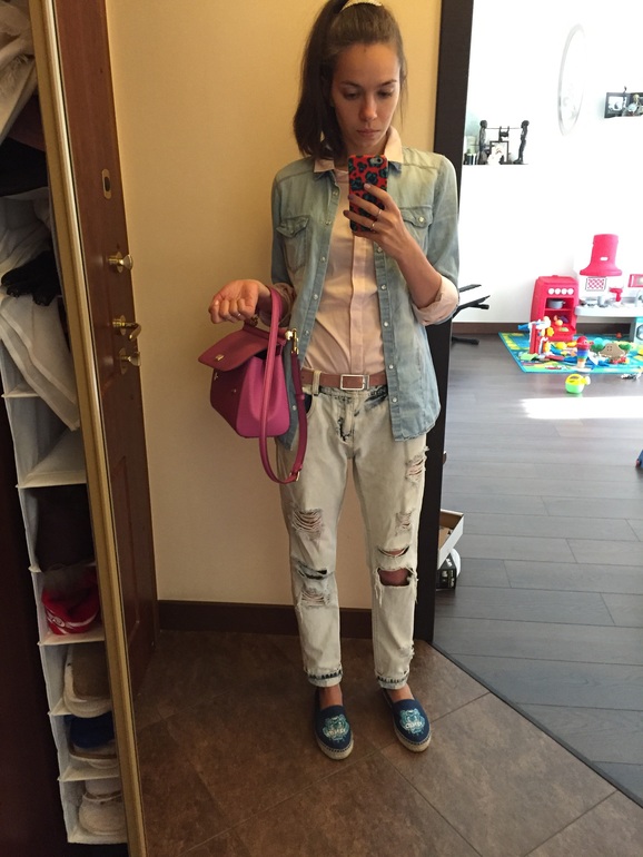 На мой взгляд сумка тут нужна другая) а под рубашку джинсовую бы тот топ шелковый из интимиссими !!!! Тогда б мммм
