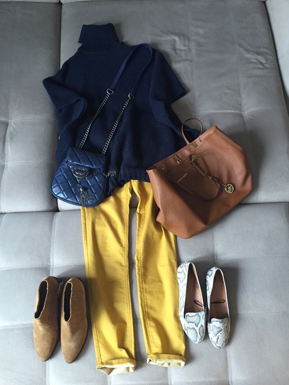 Дальше опять образ с горчичным цветом. Пончо, джинсы, ботинки - Stradivarius, рыжая сумка Michael Kors из старых запасов, лоферы ХМ, синяя сумка ноу нейм из старых запасов. У этой сумки интересная подоплека. Многие узнают в ней Шанель, была у них такая модель. Я сначала купила, потом обнаружила это. Но эта сумка не 100% копия, она хорошего качества и главное - на ней не логотип Шанель. Поэтому оставила. Как вы относитесь к таким вещам? И вот еще, может быть добавить брошь? Типа замшевого цветка?