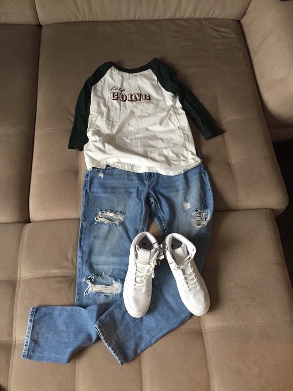 Очень простой комплект, но смотрится свежим. Кофта Stradivarius, кроссовки ХМ, джинсы ZARA из старых запасов.