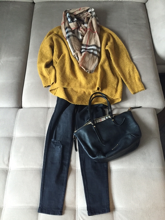 Горчичный цвет стал одним их моих любимых этой зимой. Началось все с видео-блогера Марии Бежко и ее свитера такого цвета. Свитер ХМ, джинсы Stradivarius, сумка и шарф Burberry. К комплекту есть грубые ботинки, но уж очень далеко они запрятаны оказались. Ну и я ношу Угги по совсем морозам.