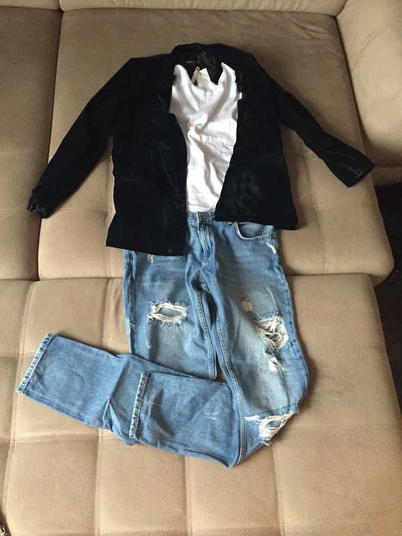 Цвет пиджака здесь изумрудный, бархатный. Один минус - очень синтетический. Аж трещит. Но дело решается антистатиком. Пиджак Stradivarius, майка ХМ, джинсы ZARA из старых запасов. Сюда хочется подобрать слипоны.