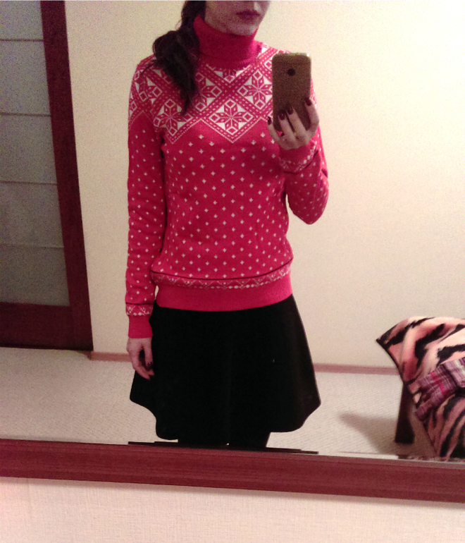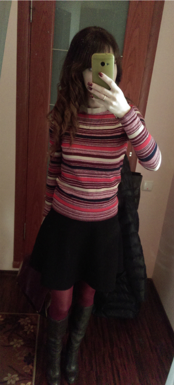 Попробовала сегодня нарядить первую вещь, получилось как-то так... обычно... больше ничего не смогла найти подходящего, колготки потом заменила на черные, потому как с пуховиком сверху смотрелось несуразно