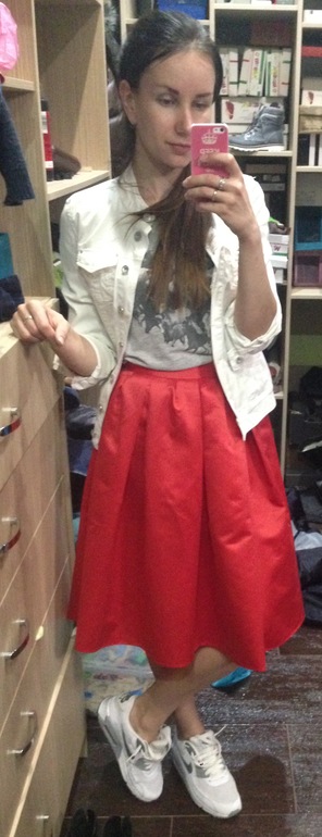 Сегодня исполнила свою давнюю хотелку: пышную красную юбку. Когда- то давно, мерила такую в Бифри, но была беременна и она , конечно, не застегнулась)))