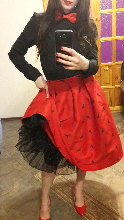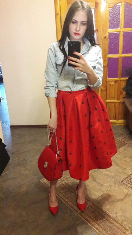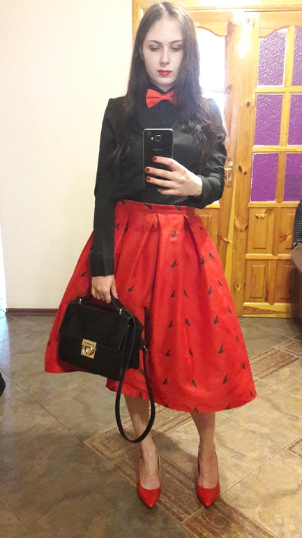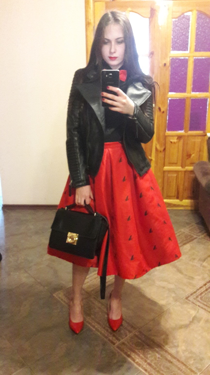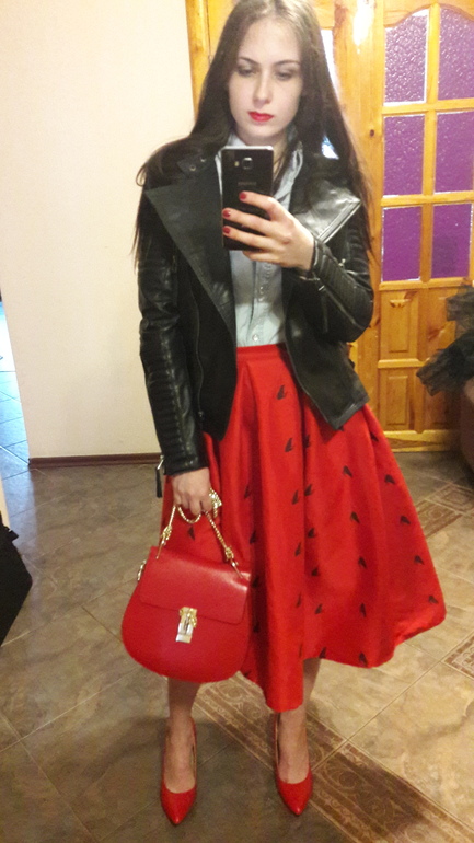 Я начиталась блог одной стилиста, теперь не могу отделаться от её мыслей. В частности что сочетание красного и черного всегда выглядит по-цыгански. Ну или типа Кармен, перебор. Хотя лично я всегда считала, что это беспроигрышный вариант... В общем, третий самый крутой)) и откуда юбка крутая такая? Не говорите, что с Али, я застрелюсь)))