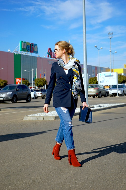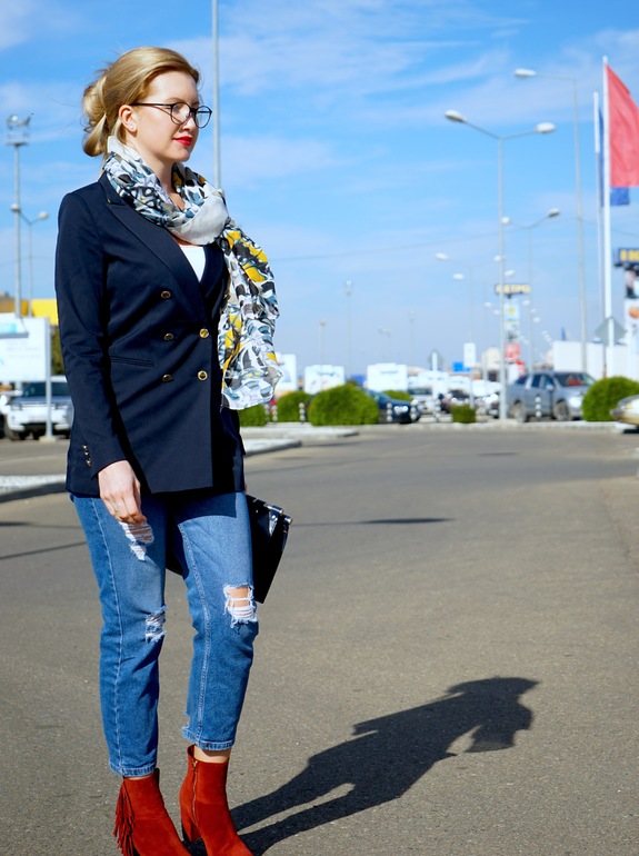 Своим примером я хотела вам показать универсальность этой вещи и один из вариантов сочетания. Жакет благодаря своей лаконичности нейтрализует расхлябанность рванных джинсов. В качестве акцента в этом образе выступает классический красный. Я вообще не приверженец яркой обуви, у меня даже нет ярко-красных лодочек, но эти ботиночки с бахромой меня покорили и прекрасно разбавили этот комплект. О красной помаде думаю, и говорить не стоит, это уже классика жанра. Ну а принтованый шарф завязал воедино всю цветовую палитру данного образа.