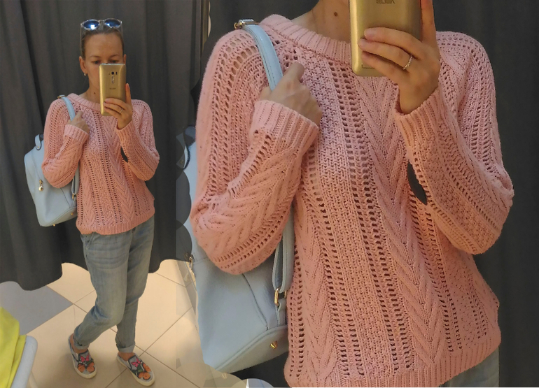 ПосоветуйтеИскала я себе что-нибудь розовенькое)) и тут увидела вот этот свитер и даже сфоткалась в примерочной. Состав хлопок, цена смешная. Только вот я все равно сомневаюсь, а оно мне надо? смущает вязка и не смотрится ли он совсем дешево. с чем носить придумаю, цвет очень приятный.