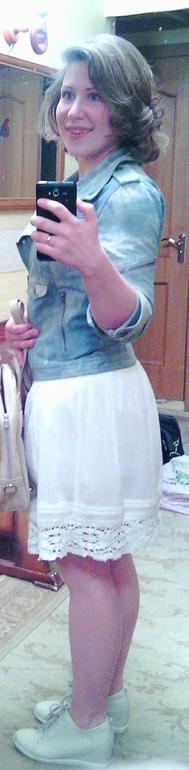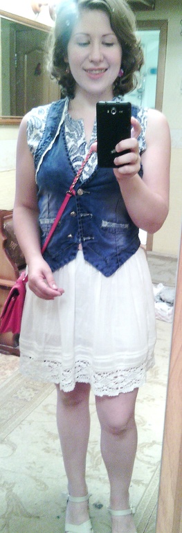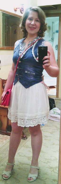 4. Джинсовая жилетка есть ( она в жизни светлее, чем на фото, голубая и тоже с кружевом) . может ее поверх простой футболки? Не успела примерить такой вариант)