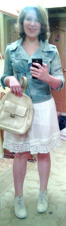 1. Пытаюсь миксовать банальное грубое с нежным. Джинсовка, кеды. Рюкзак можно бы другой, но пока лишь такой