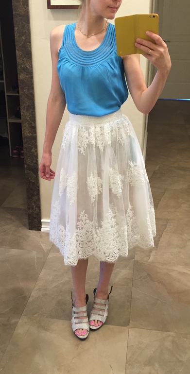 Ну и по юбке кружевной опять. Нашла у себя давний-предавний шелковый топ. Есть еще голубые замшевые босоножки к нему, хорошо будет?
