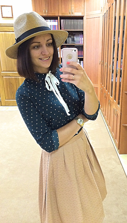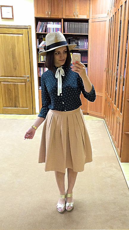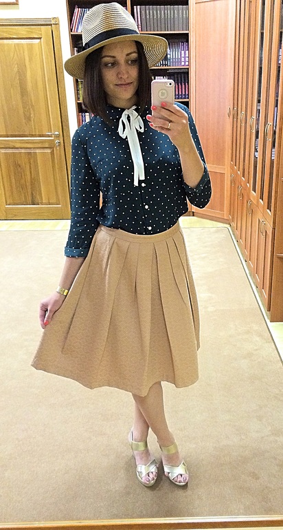 Плюсуюсь ко мнению, что обувь с блузкой вместе "глаз режут". Мне кажется под такую шляпу даже больше не лододочки бы сюда подошли, а ботиночки/лоферы или как там теперь это принято называть) Помню ботиночки на плоском ходу какие-то у вас точно были)